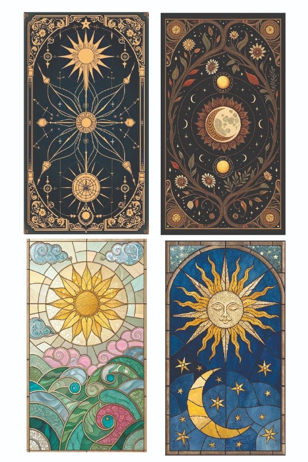 Iluminá tu journal, agenda o proyecto creativo con esta plancha A5 inspirada en el universo místico del sol y la luna. Cuatro ilustraciones llenas de detalles, líneas doradas, energía celestial y un estilo que mezcla lo tarot, lo art nouveau y lo mágico.